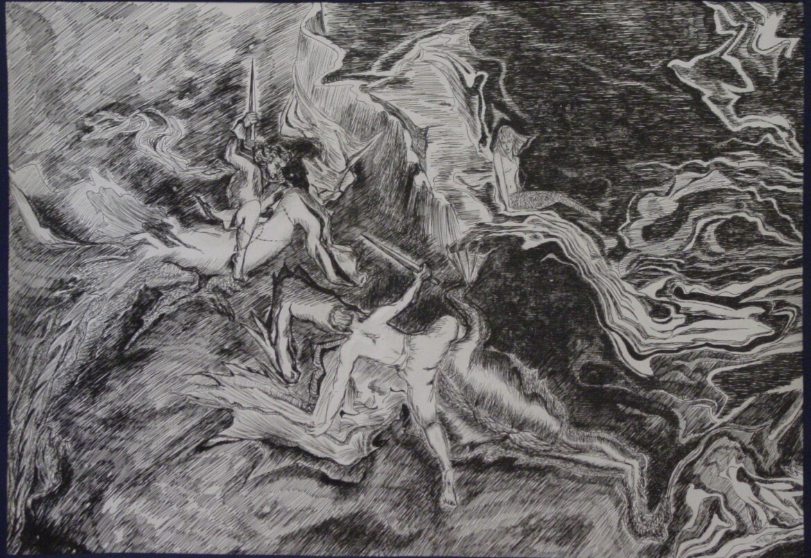 Фото: «Битва атлантов на драконах за русалку». Иллюстрация к авторской сказке «Агат-волос», 2005 г. Бумага, тушь. 59х41,7 см / Предоставлено Ладой Аюдаг