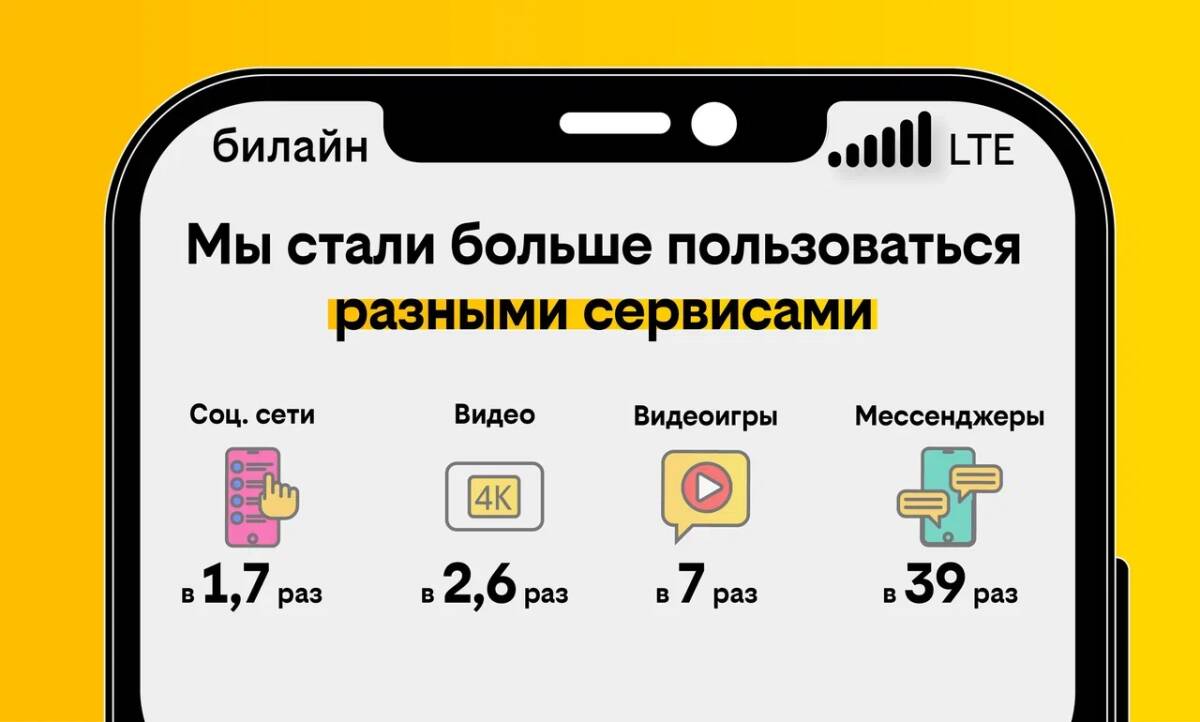 Благодаря развитию сети и технологий клиенты оператора стали больше общаться с близкими, чаще звонить по видеосвязи, играть онлайн, смотреть видеои узнавать новое. В итоге объем трафика, который ежемесячно использует один клиент билайн, увеличился в 4 раза.