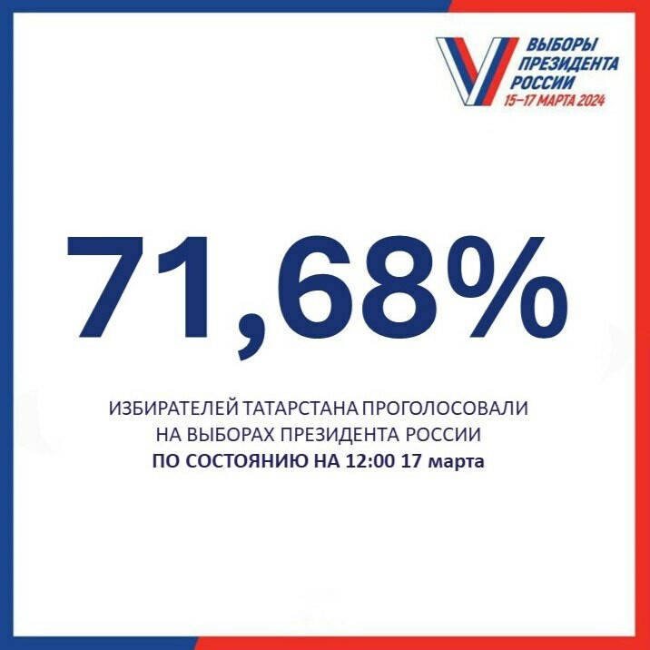 Явка избирателей на выборах Президента России в Татарстане, по данным системы ГАС «Выборы» на 12 часов 17 марта, – 71,68%