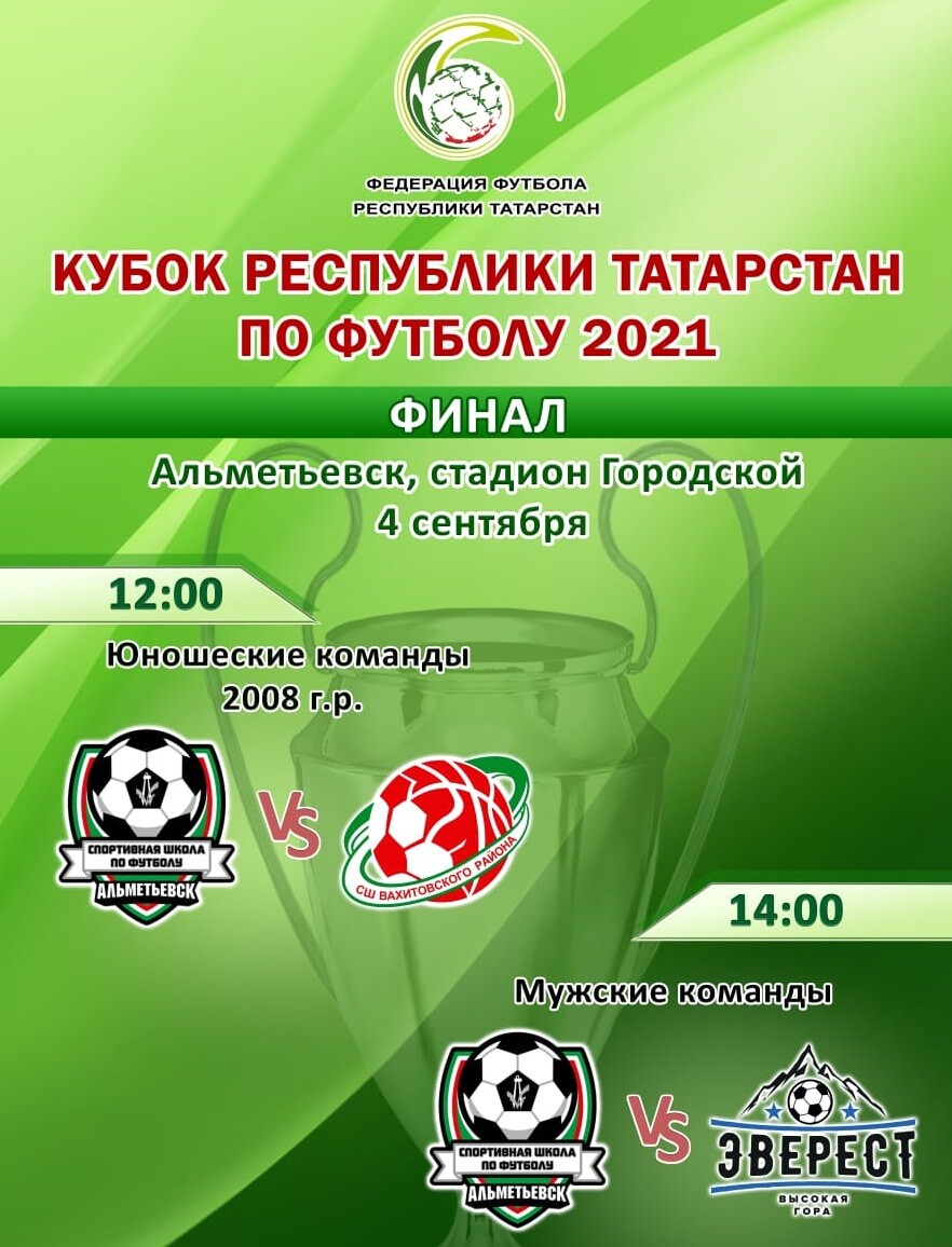 Напомним, что в следующую субботу, 4 сентября, в Альметьевске состоятся финалы Кубка Татарстана по футболу. Сначала на поле городского стадиона в 12:00 выйдут юношеские команды (составленные из игроков 2008 года рождения) спортшколы по футболу Альметьевска и команда СШ «Вахитовского района» Казани.