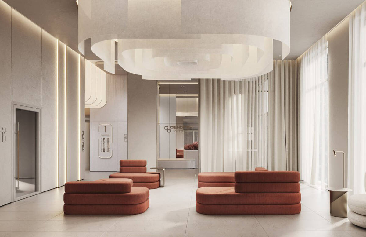 Каждый подъезд — это отдельное лобби с дизайнерской отделкой. Здесь будет зона ожидания, коворкинг-пространство, санузлы для гостей, места хранения колясок и многое другое.