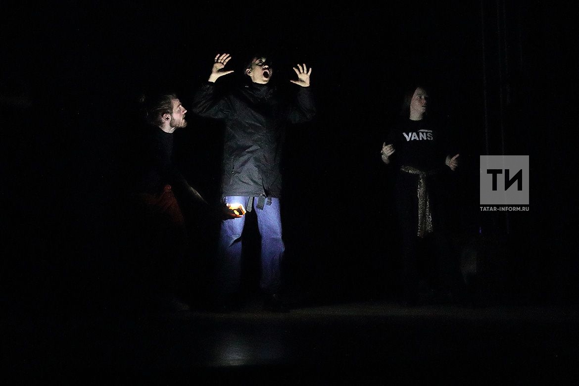 Понимать, о чем говорят действующие лица, зрителям помогали титры на небольшом экране справа от сцены. Всего для исполнения постановки в Казани из города Глазго приехали шесть актеров, двое техников и один из двоих режиссёров-соавторов.