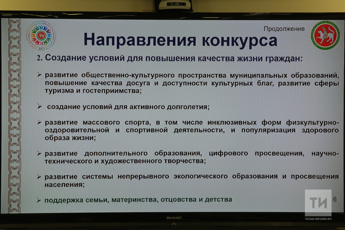«Конкурс проходит по двум основным направлениям: “Развитие институтов гражданского общества” и “Создание условий для повышения качества жизни”. По первому направлению есть новая номинация “Проведение мероприятий, посвященных Году родных языков и народного единства РТ”. По второму направлению есть новая номинация “Поддержка семьи, материнства, отцовства и детства”», – пояснил замминистра экономики РТ Олег Пелевин.