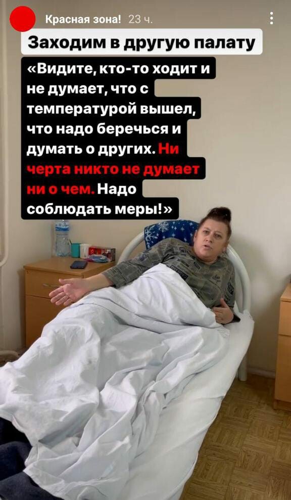 «Экскурсию» по «красной зоне» провела заведующая терапевтическим отделением №4 Елена Чупрова. По словам врача, в одной из палат лежит ее коллега, бывшая медсестра, с большим поражением легких.