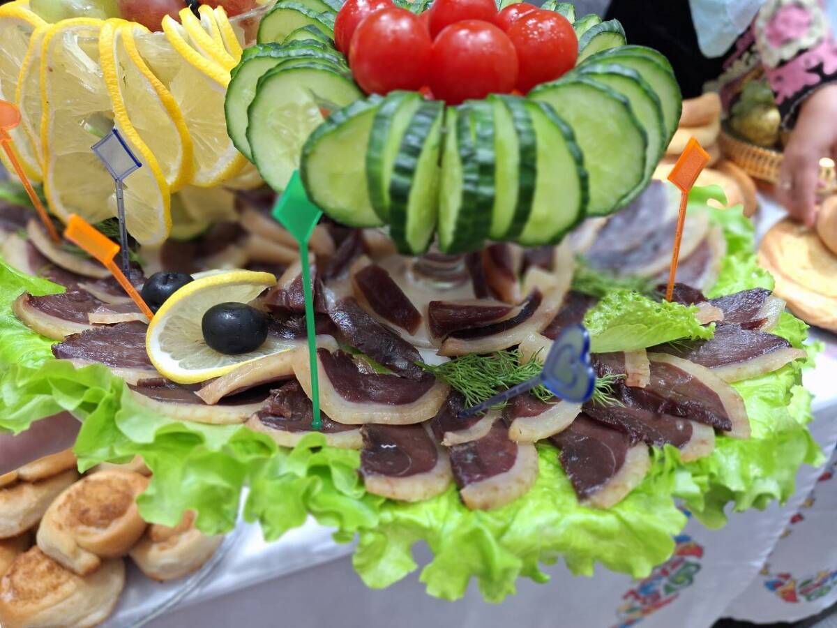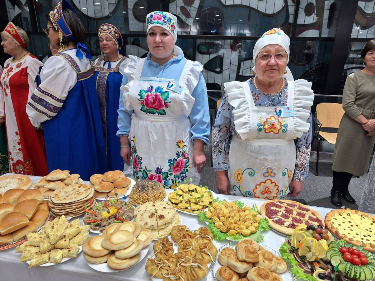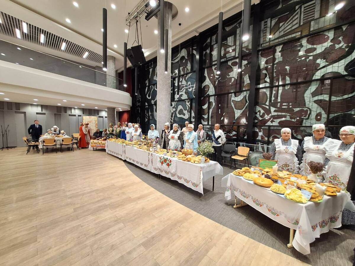 Фойе второго этажа КЦ «Сайдаш» было полностью отведено под кулинарную выставку — весь холл заняли богато накрытые столы. И это не случайно, ведь именно Тюлячинский район является родиной «отца татарской кухни» Юнуса Ахметзянова.