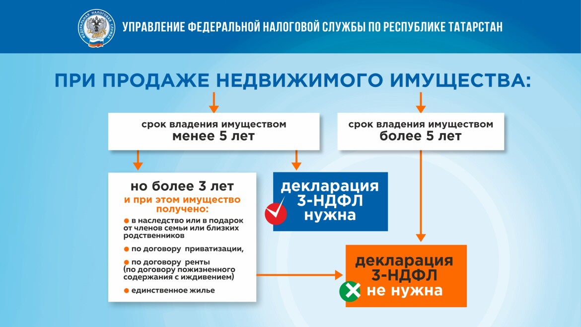 Сафиуллин напомнил, что минимальный предельный срок владения имуществом составляет пять лет. Но есть исключения из этого правила: минимальный срок владения, при котором необязательно представлять декларацию, составляет три года, если имущество получено в наследство или в подарок от членов семьи или близких родственников, по договору приватизации, по договору ренты, или если продано единственное жилье. При продаже иного имущества, включая транспортные средства, минимальный срок владения составляет три года.