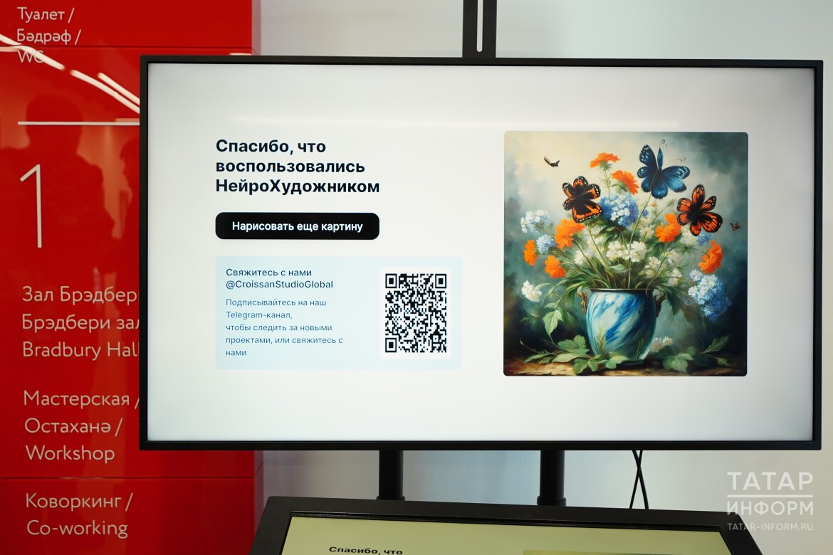 Кроме того, при входе расположен любопытный аппарат, где установлена нейросеть, разработанная в Университете Иннополис. Она в считаные секунды из простого наброска рисунка рисует картины в стиле одного из четырех выбранных пользователем художников: Пабло Пикассо, Винсента Ван Гога, Ивана Шишкина и Хаяо Миядзаки.