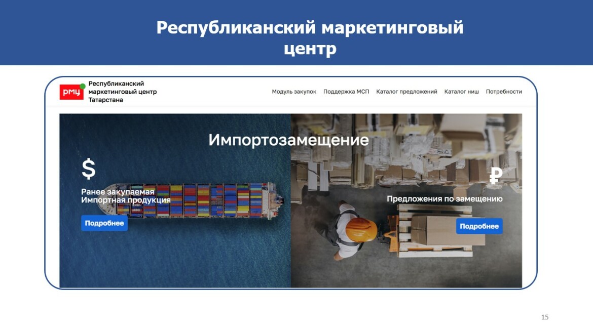 По ее словам, одним из инструментов налаживания новых производственно-сбытовых цепочек является биржа «Импортозамещение» Республиканского маркетингового центра. Система позволяет найти новых потребителей, а также российские аналоги импортных комплектующих. Так, например, резидент ТОСЭР компания «Химресурс» представила свои возможности в качестве поставщика эпоксидной смолы — стратегически важного компонента для производства композитов.