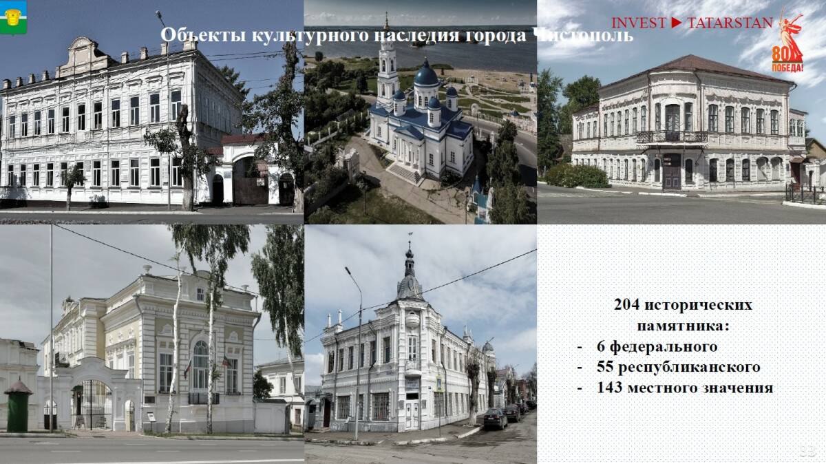 Чистополь — это историческое поселение федерального значения, на территории которого 204 исторических памятника, среди которых шесть федерального значения, 55 — республиканского и 143 — местного.