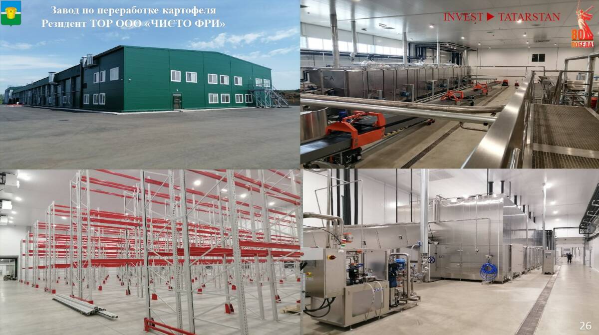 Мощный рост индексу промпроизводства в этом году может дать завод по производству картофеля фри «Чисто фри». Первую очередь хотят запустить в этом году после сбора урожая, рассказал гендиректор управляющей компании АО ХК «Чистополье» Наиль Залаков. Общие инвестиции в предприятие оцениваются в 3 млрд, а 2 млрд рублей уже вложены. При выходе на полную мощность ожидается выручка в 2,4 млрд рублей.