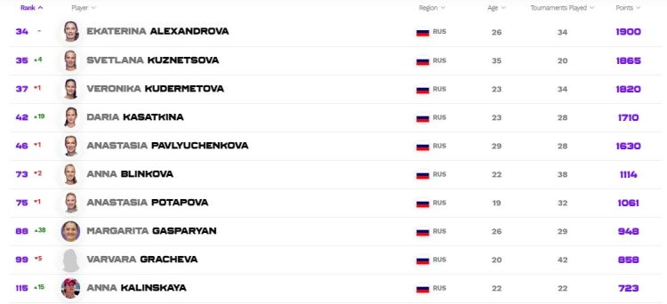 Лучшая среди россиянок — Екатерина Александрова — осталась на 34-й позиции в рейтинге WTA. Второй ракеткой России стала Светлана Кузнецова, которая поднялась на четыре строчки и занимает 35-е место.