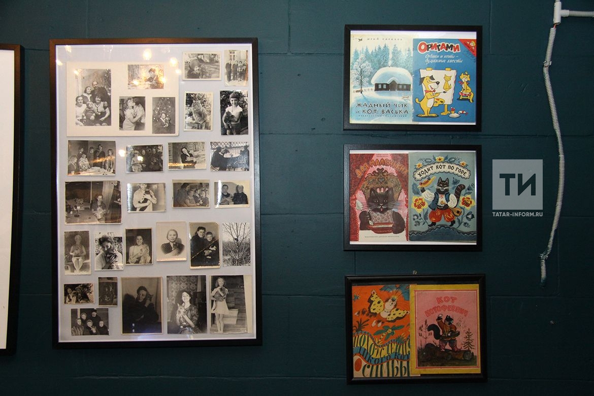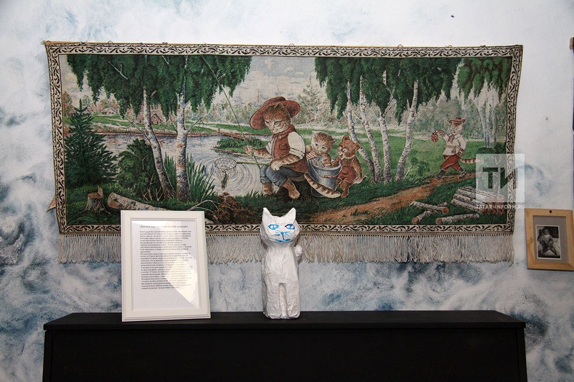 По словам директора Свияжского музея-заповедника, после этого он начал собирать различные вещи с изображениями котов. Всего на выставке представлено около 100 экспонатов, среди которых есть и картины, и панно, и фотографии, и обложки.