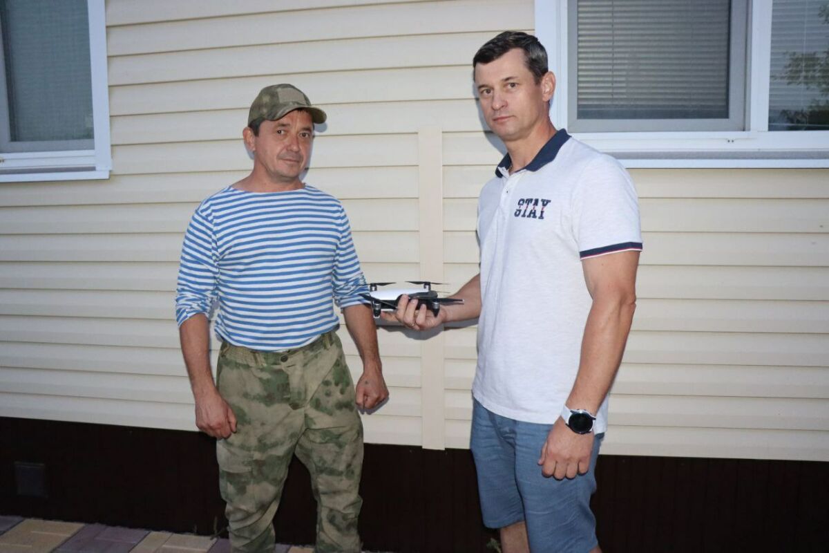 Приехав в Нурлат, Алексей Кулагин первым делом направился к руководителю общественной организации «Боевое братство» Зиннуру Мутагирову. Здесь же встретился со своим коллегой-волонтером Алмазом Файзутдиновым, передал для доставки военным личный квадрокоптер.