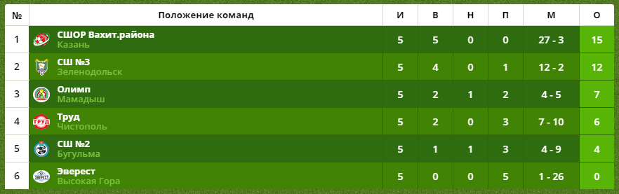 В двух последних турах казанская команда обыграла СШ №2 из Бугульмы (5:0) и «Олимп» из Мамадыша (1:0). Таким образом, СШОР Вахитовского района Казани выиграла все пять матчей и завоевала первое место. Команда будет представлять Татарстан в финальной части всероссийского турнира.