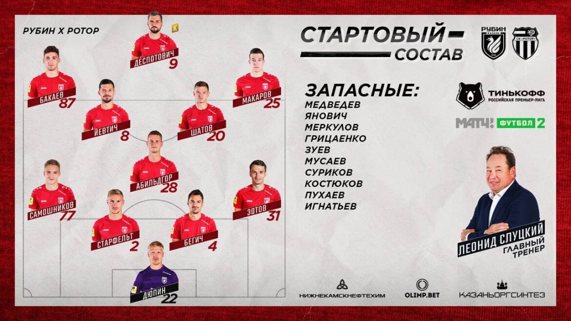 Стартовый состав «Рубина» на матч с «Ротором» выглядит следующим образом: Юрий Дюпин, Илья Самошников, Карл Старфельт, Сильвие Бегич, Георгий Зотов, Оливер Абильдгор, Солтмурад Бакаев, Дарко Йевтич, Олег Шатов, Денис Макаров, Джордже Деспотович.
