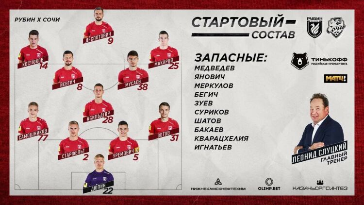 Вместо Кварацхелии на месте левого атакующего полузащитника сыграет Михаил Костюков. Также стоит отметить возвращение в стартовый состав центральных полузащитников — Дарко Йевтича и Леона Мусаева. В остальном состав «Рубина» — оптимальный (без учета травмы корейского полузащитника Ин Бом Хвана).