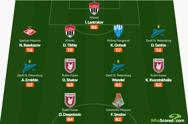 Помимо игроков «Рубина» в символической сборной присутствуют три представителя «Зенита», два футболиста «Химок» и по одному – из «Спартака», «Нижнего Новгорода» и «Локомотива».