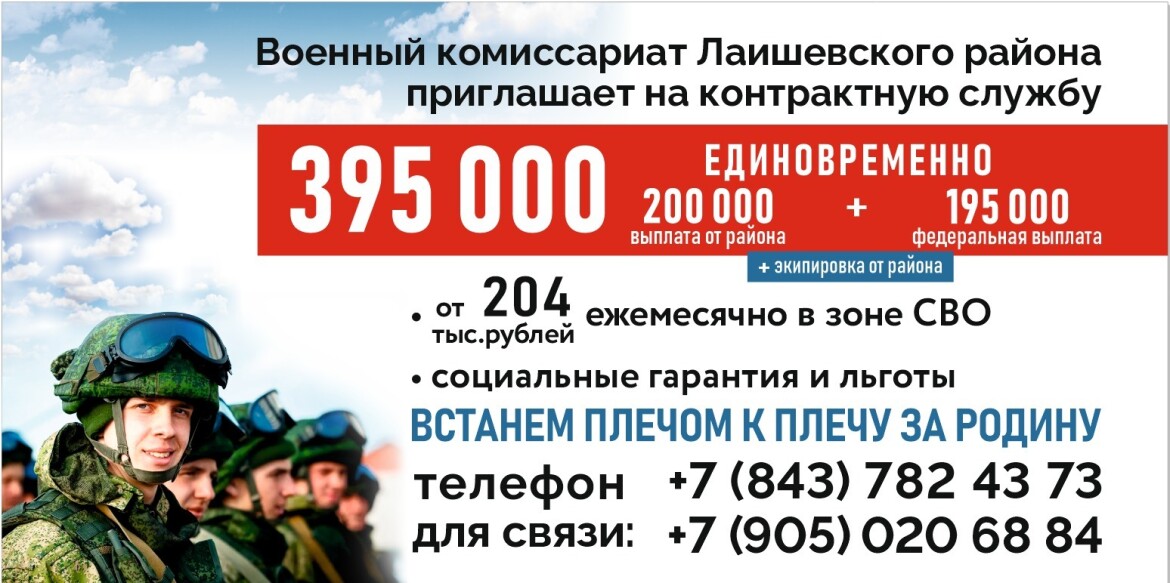 Всем военнослужащим из Лаишевского района Татарстана, заключившим контракт о прохождении военной службы сроком на один год и более, назначена дополнительная единовременная выплата от муниципального образования в размере 200 тыс. рублей. Таким образом, контрактники из Лаишевского района единовременно получат 395 тыс. рублей. Об этом «Татар-информу» сообщили в военном комиссариате района.