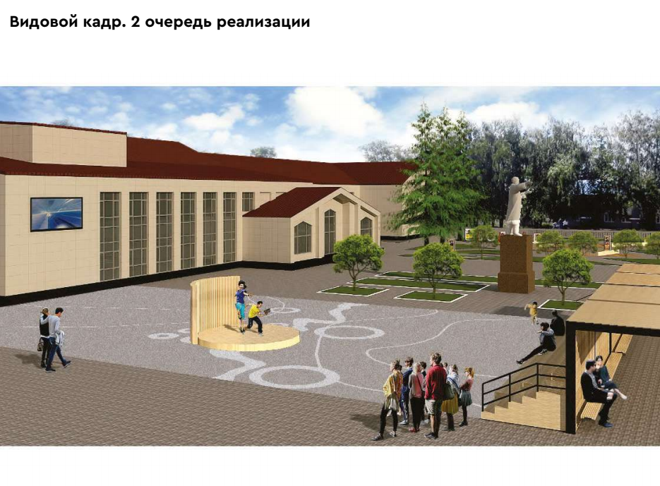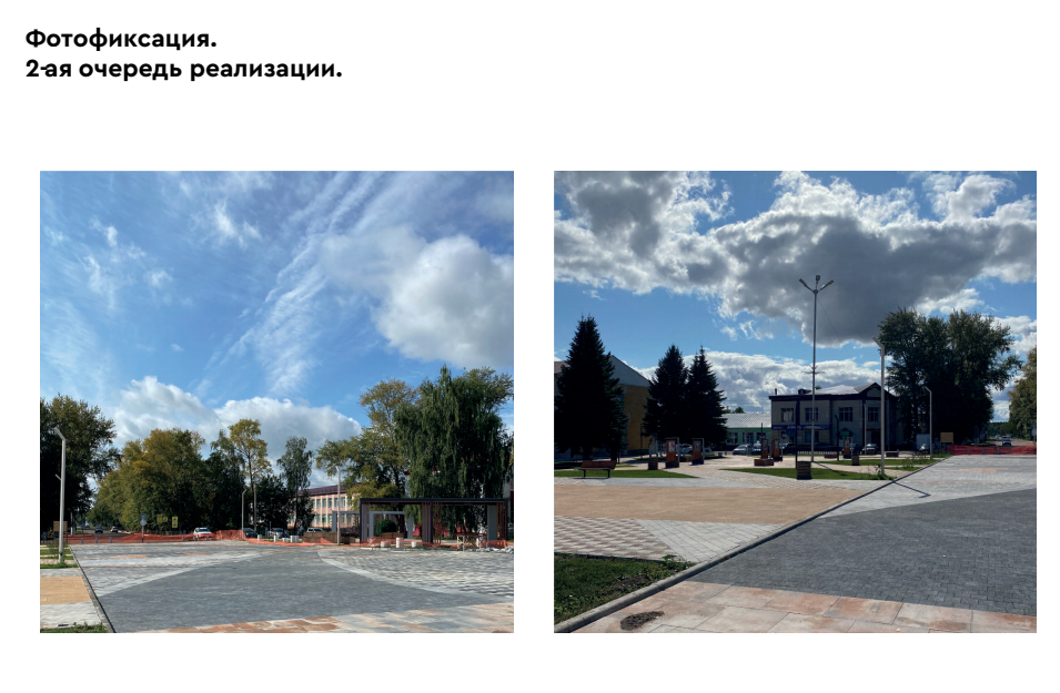 Во второй очереди выполнено покрытие из брусчатки между зонами, освоенными в первую очередь реализации, и продолжено в сторону районного Дома культуры, установлен амфитеатр и опоры освещения, частично выполнено озеленение.