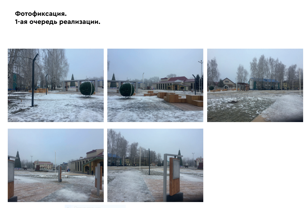 В первой очереди было выполнено устройство покрытий из брусчатки, установлены малые архитектурные формы в виде скамеек, урн, навеса и навеса с качелями, зоны шахмат, стенды, освещения и арт-объекта Болгар.
