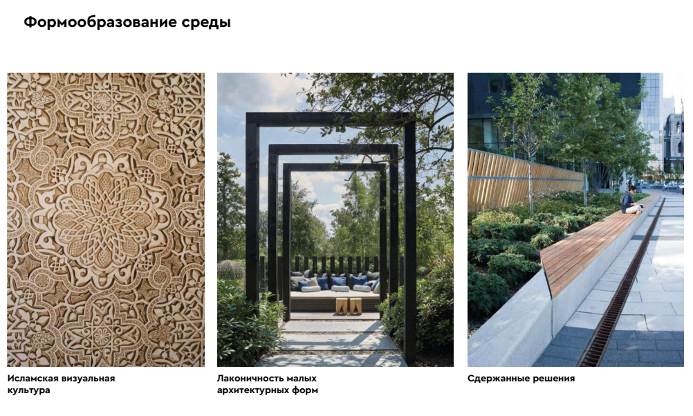 По задумке архитекторов, типология малых архитектурных форм основана на главной идее лаконичности и сдержанности, что очень характерно для современной исламской архитектуры и отражает основную идею проектирования площади как центрального городского объекта благоустройства с функциями массового посещения жителями и гостями города. Историческая и культурная идентичность с древней Булгарией нашла свое отражение в деталях отделки арок, арт-объектов, МАФов.