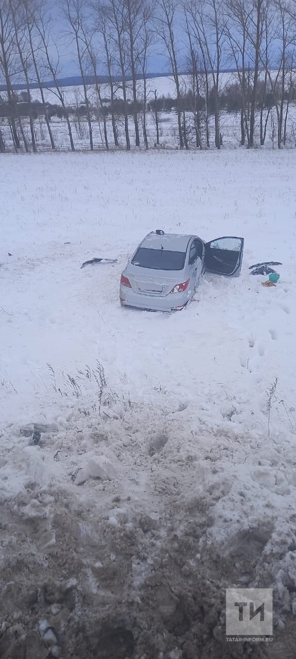 На трассе в Альметьевском районе автомобиль Hyundai вылетел в кювет. Предположительно, водитель не справился с управлением на скользкой дороге.