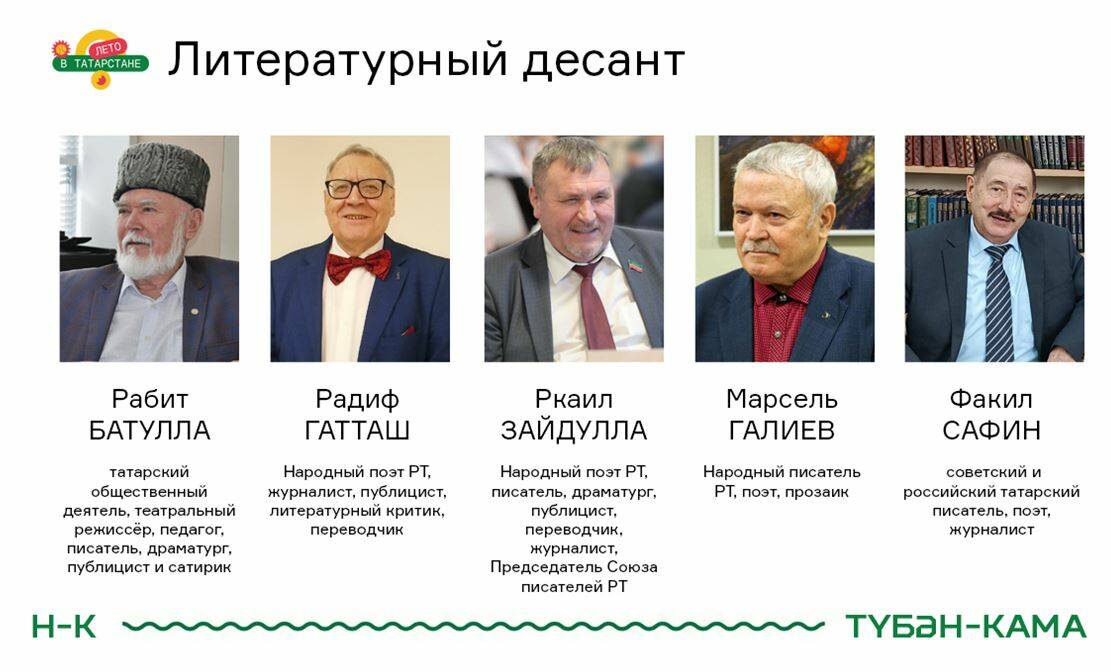 Летом в Нижнекамск приедут известные писатели Татарстана: Рабит Батулла, Марсель Галиев, Радиф Гаташ, Факиль Сафин, Ркаил Зайдулла, Алмаз Хамзин. Теплая встреча с ними состоится у памятника Габдулле Тукаю. Жителей города и сельских поселений приглашают всей семьей познакомиться с авторами лично.