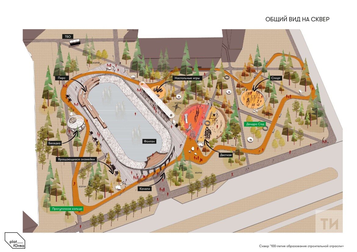 Вокруг фонтана уложат пешеходные дорожки, установят беседку, качели, спортивную и детскую площадки. Кроме того, в тематической привязке к названию здесь разместят стенды с информацией о строительной отрасли Татарстана.