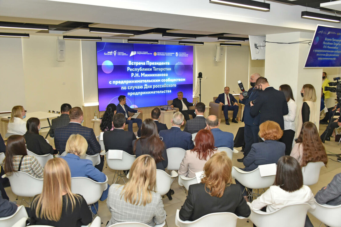 Перед началом дискуссии Рустам Минниханов осмотрел выставку-ярмарку изделий, открытую в казанском Доме предпринимателя, пообщавшись с самозанятыми и владельцами малого бизнеса. Сама встреча началась с искренних поздравлений Президента Татарстана всему предпринимательскому сообществу республики.