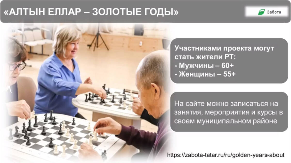 Проект «Золотые годы» в рамках чат-бота «Забота» в дальнейшем будет запущен по всей республике. Его участниками смогут стать женщины старше 55 лет и мужчины старше 60 лет. На сайте они смогут записаться на подходящие занятия и курсы в своих районах.