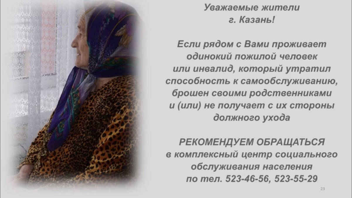 Министр труда, занятости и соцзащиты РТ призвала татарстанцев, в окружении которых есть одинокие пожилые люди и инвалиды, нуждающиеся в уходе и утратившие способность к самообслуживанию, звонить в Комплексный центр социального обслуживания по телефонам 523-46-56, 523-55-29 или в службу «112».