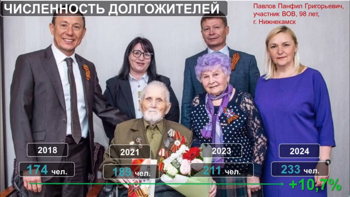«В регионе увеличивается число людей старше 100 лет. Если в прошлом году таких долгожителей было 211, то сегодня их уже 233 человека. Самая пожилая женщина живет в Елабуге, ей 107 лет. Самому пожилому мужчине 104 года, он живет в Пестрецах. Мужчин, перешагнувших столетний рубеж, более 20 человек, а женщин – около 200», – сообщила Эльмира Зарипова.
