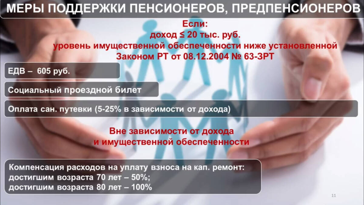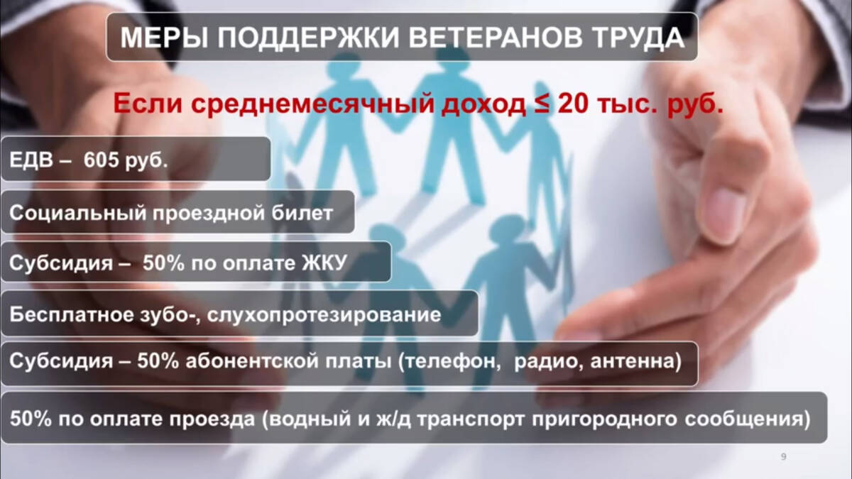 «Тем, кто стал льготниками до 2016 года, льготы предоставляются без учета доходов. В 2016 году политика стала более адресной, мы смотрим доходы, имущественный уровень людей. Меры поддержки государства теперь направлены наиболее нуждающимся. Это ежемесячная денежная выплата в размере более 600 рублей. Такова цена проездного социального билета. Для других категорий социальный проездной билет стоит более 3 тыс. рублей. Кроме того, выдается субсидия на оплату ЖКУ в размере 50%, предоставляется бесплатное зубо- и слухопротезирование, а также субсидия в размере 50% абонплаты за антенну, телефон, радио», – пояснила министр.