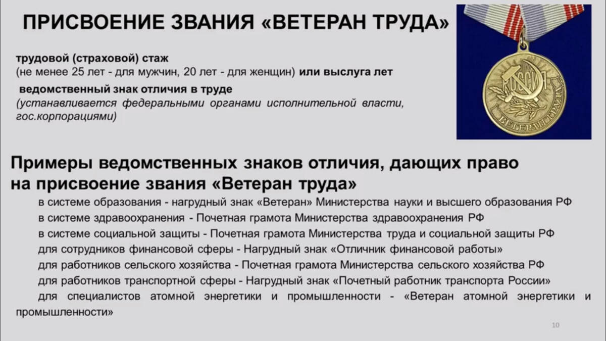 «Для этого нужен стаж – для мужчин не менее 25 лет и не менее 20 лет для женщин – и ведомственные награды. Это значит, отрасль, в которой вы работали, должна ваш вклад поощрить. Они (ведомственные награды) разные и устанавливаются на федеральном уровне. Для системы образования это нагрудный знак «ветеран», в системе здравоохранения и социальной защиты – почетная грамота», – сказала Зарипова.