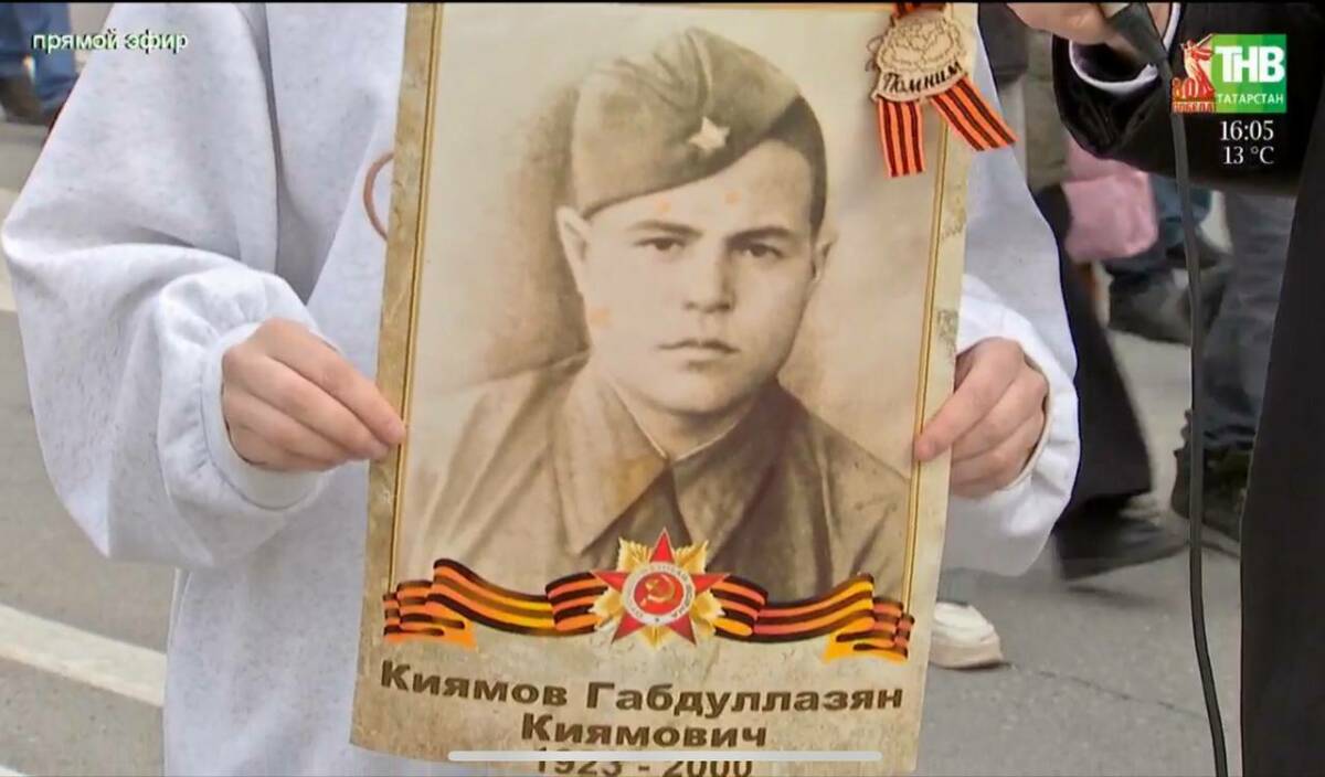 «Это мой прадед Габдуллазян Киямов. В 18 лет его отправили на фронт, он попал на Ленинградскую битву и там защищал свою Родину. Он был минометчиком, стал свидетелем самой громкой танковой битвы. Он не много рассказывал о войне и не любил говорить об этом. Но всегда повторял одну фразу: “Лишь бы не было войны”», – рассказала юная участница акции «Бессмертный полк» Лиана.