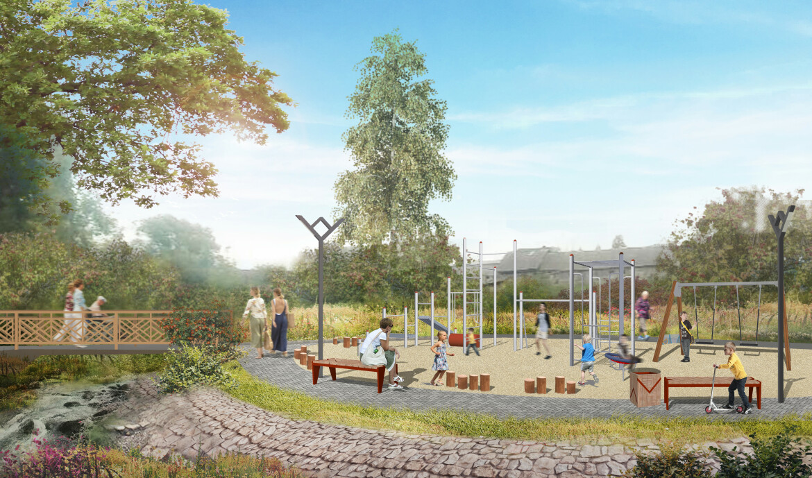 В планах реализовать уникальную площадку: там будет сухой фонтан, зеленый холм и песчаное покрытие — так, площадка будет вызывать разнообразные тактильные ощущения и способствовать всестороннему развитию детей. Помимо этого, появится декоративный фонтан, памп-трек для подростков, а также лаундж-зона для спокойного отдыха родителей и пожилых жителей.