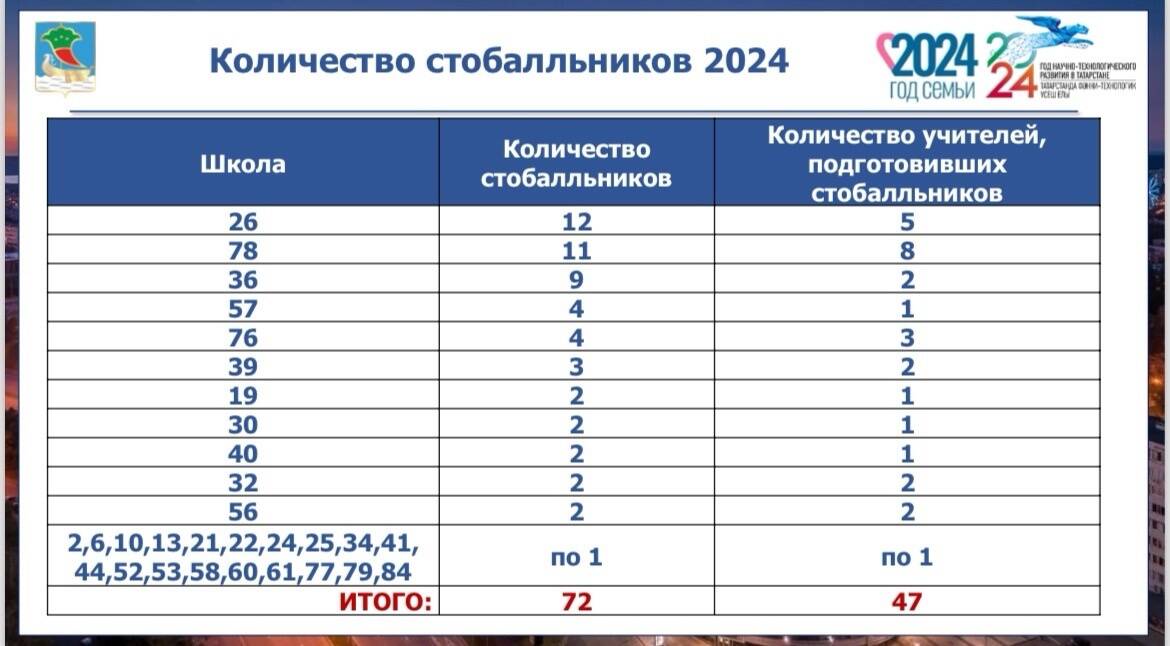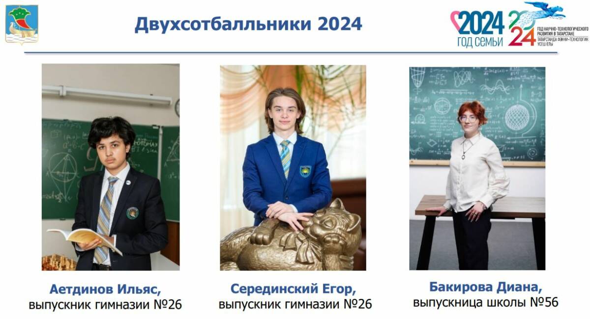 «Социальный статус учителя помогают повысить стобалльные результаты по ЕГЭ. В этом году в городе их 72, трое выпускников имеют по два стобалльных результата. Это Аетдинов Ильяс и Серединский Егор — гимназия № 26 и Бакирова Диана из школы № 56», — рассказал докладчик.