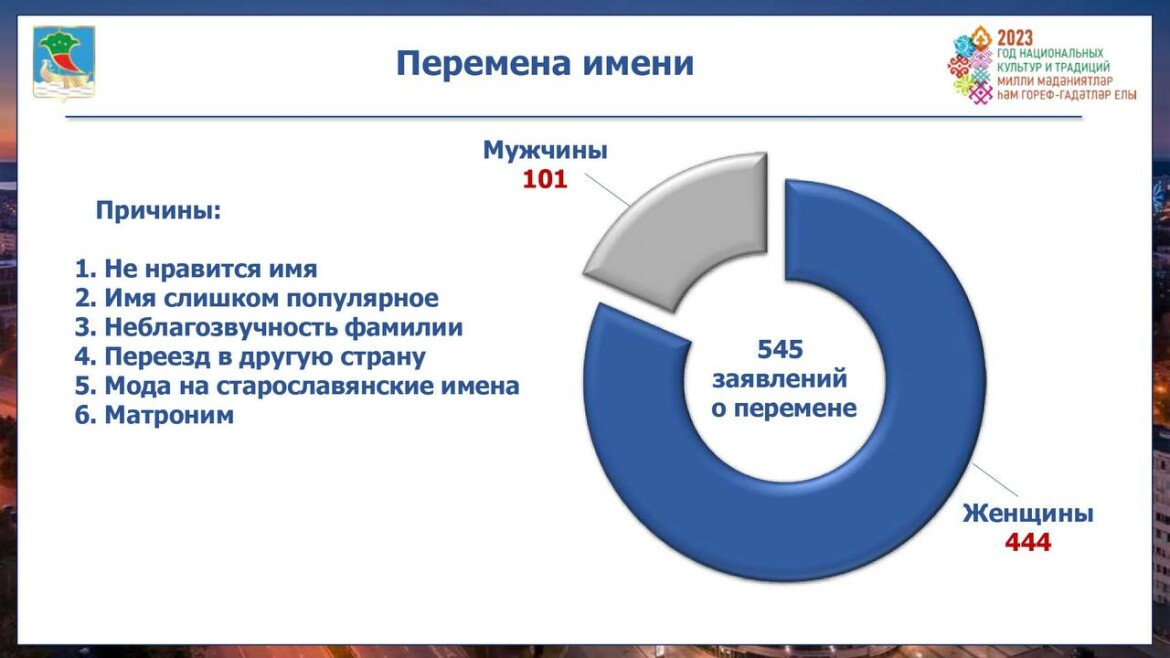 В прошлом году за переменой имени, фамилии, отчества в Управление ЗАГС Набережных Челнов обратились 545 человек, что на 23% больше, чем годом ранее. Среди желающих сменить имя оказались 444 женщины и 101 мужчина.