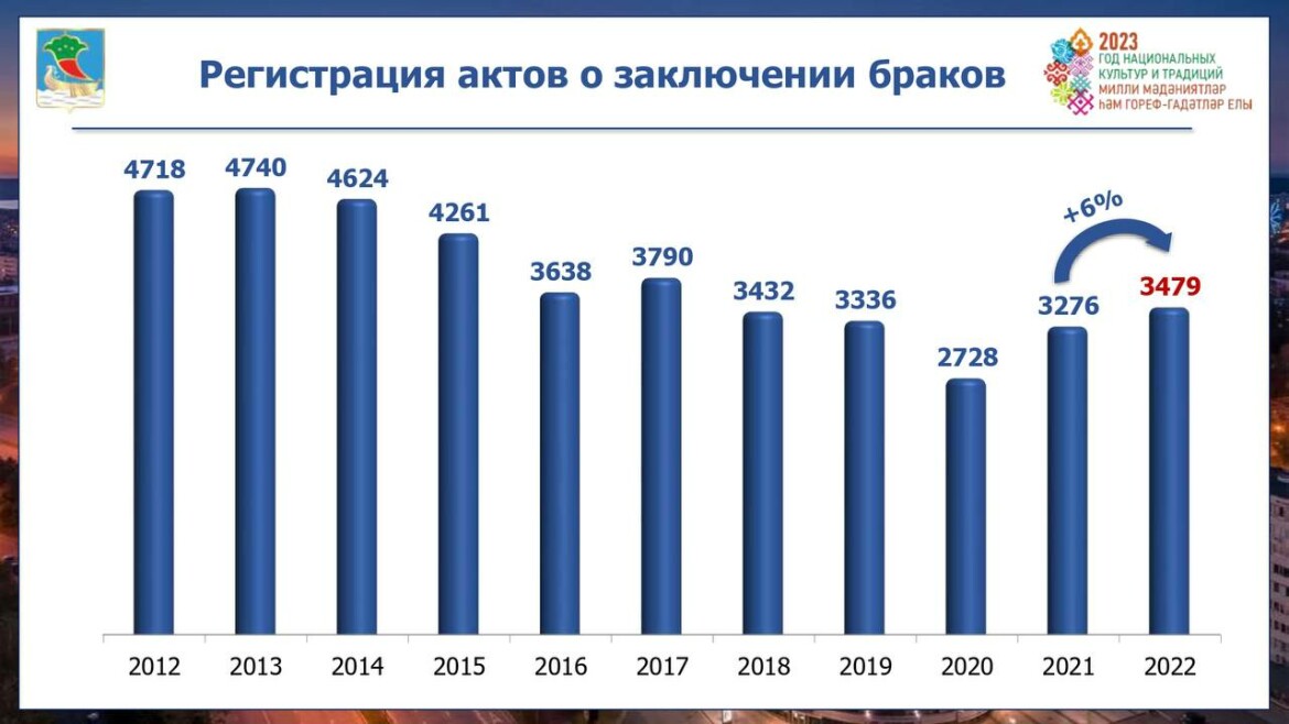 О демографической ситуации в Автограде доложила начальник Управления ЗАГС Набережных Челнов Равиля Зарипова. Она сообщила, что в 2022 году в городе зарегистрировано более 18,1 тыс. актов гражданского состояния. «Наш город один из немногих в республике, где рождаемость превышает смертность. Естественный прирост населения по результатам прошлого года составил более 1,4 тыс. человек», – отметила докладчица.