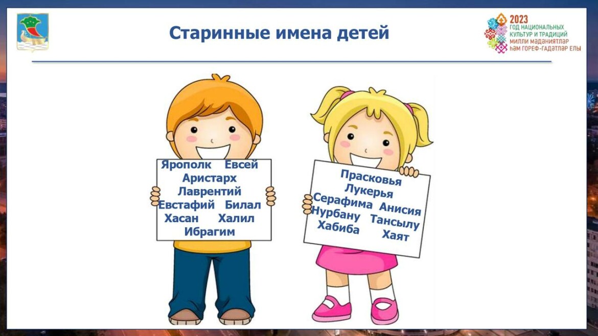 По ее словам, стали популярными старинные имена — из русских имен чаще встречаются Ярополк, Евсей, Аристарх, Прасковья, Лукерья, Серафима. Из старинных татарских имен — Билал, Халил, Нурбану, Тансылу, Хаят.