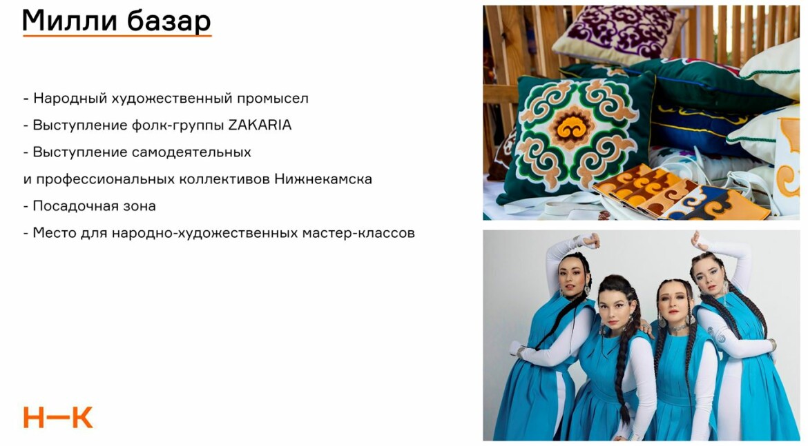 «Они представят изделия декоративно-прикладного творчества: резьбу по дереву, гончарное ремесло, изделия из войлока и кожи, ювелирные украшения, керамическую посуду, лоскутное шитьё, авторских кукол и многое другое. В концертную программу площадки вошли выступления артистов фольклорной группы «Закария» и творческих коллективов Нижнекамска.