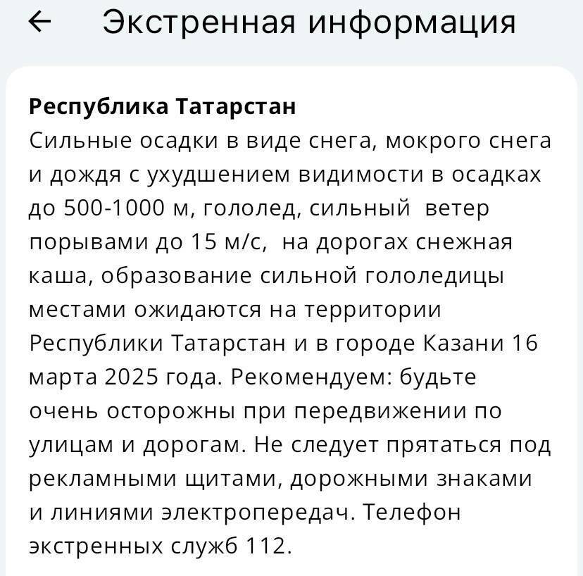 Кроме того, будет дуть сильный ветер порывами до 15 м/с. На дорогах образуется снежная каша и сильная гололедица (в Казани последняя вероятна на некоторых участках дорог).