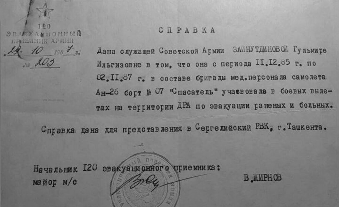 Проработав полгода в госпитале медсестрой, Гульмира узнала, что освободилось место медсестры на эвакуационном самолете Ан-26М, и она попросила о переводе.