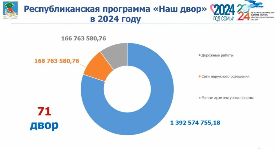 В этом году на ремонт дорог во дворах Челнов будет направлено 1,3 млрд рублей, 166 млн рублей на малые архитектурные формы и столько же на освещение.