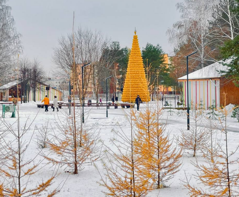 В центральном парке «Семья» Нижнекамска появилась новогодняя ель ярко-желтого цвета