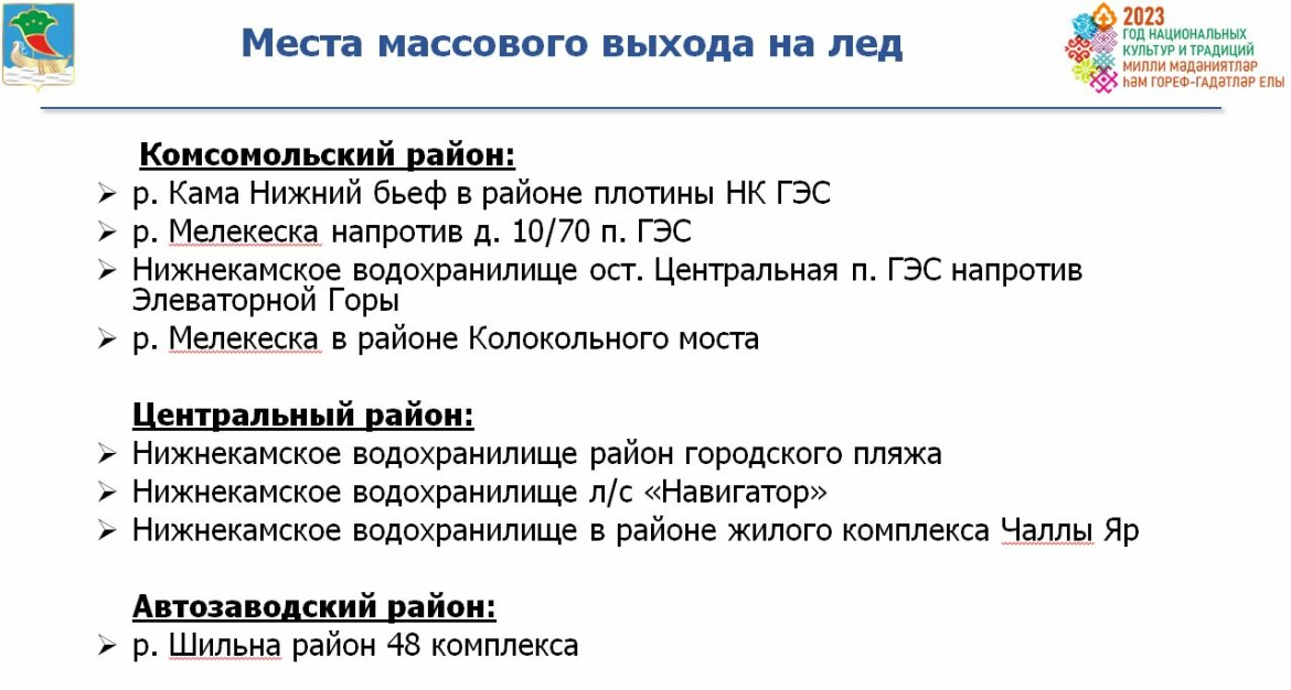 Нугуманов назвал места массового выхода на лед, на которые властям следует обратить особое внимание. Больше всего их в Комсомольском районе: Нижний бьеф в районе плотины Нижнекамской ГЭС, на реке Мелекеске напротив дома 10/70, напротив Элеваторной горы в районе улицы Центральной и у Колокольного моста. В Центральном районе они находятся у городского пляжа, у лодочной станции «Навигатор» и в районе «Чаллы Яра», в Автозаводском — на реке Шильне в районе 48 комплекса.
