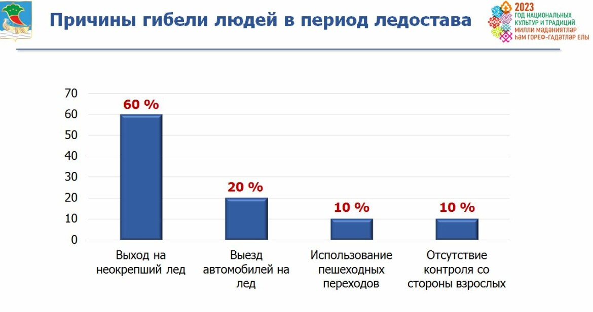 Основная причина гибели людей (60%) в период ледостава — выход на неокрепший лед. Еще 20% — выезд на лед автомобилей. Использование несанкционированных пешеходных переходов и отсутствие контроля со стороны взрослых — по 10%.