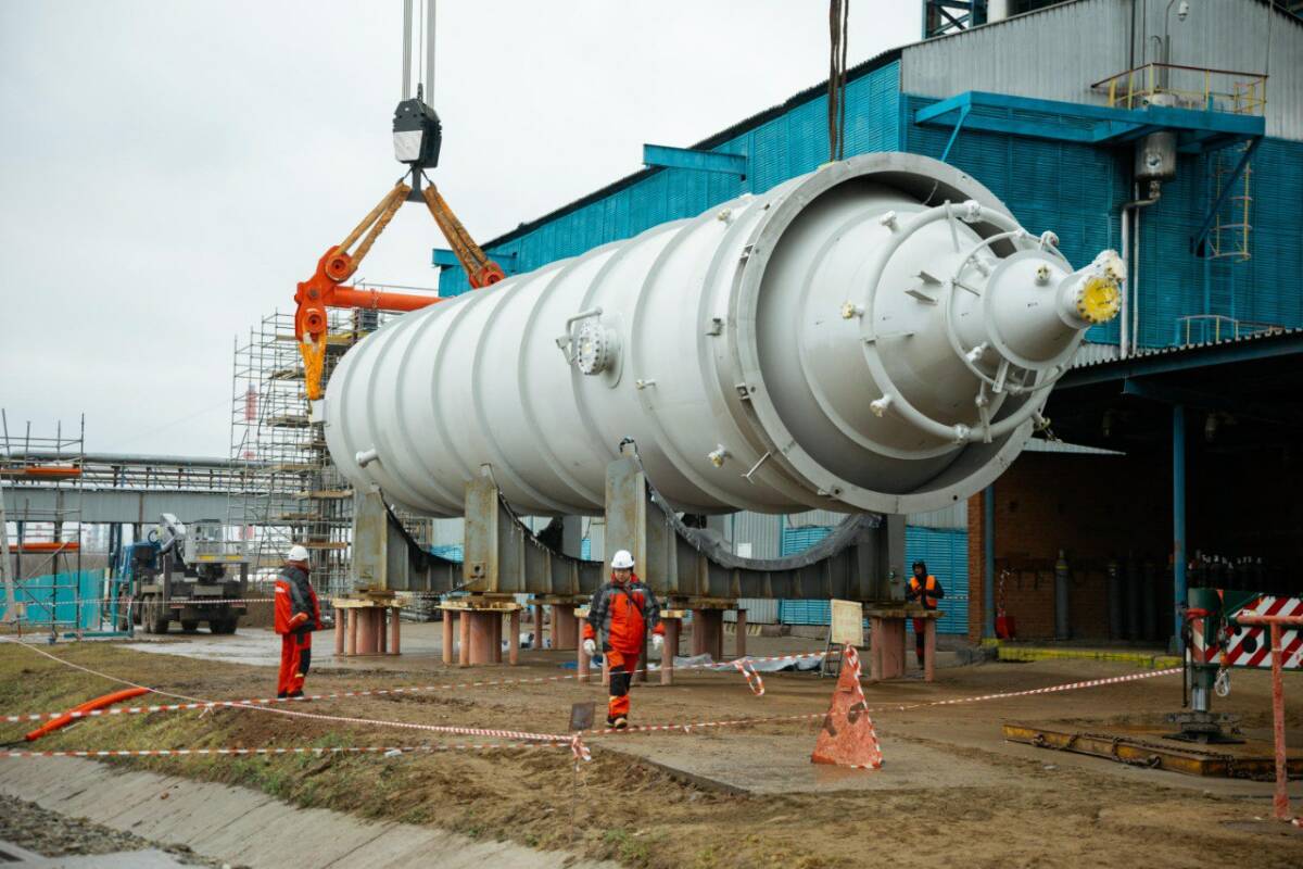Одним из первых крупных объектов на площадке была установлена продувочная емкость высотой 30 метров и массой 110 тонн. Для доставки оборудования построили дорогу из железобетонных плит протяженностью почти километр и подготовили площадку для работы тяжелой грузоподъемной техники. Сейчас ведется монтаж установки разделения пропана и азота, которая играет ключевую роль в подготовке сырья. Завершение монтажа основного оборудования по этой установке намечено на третий квартал 2026 года.