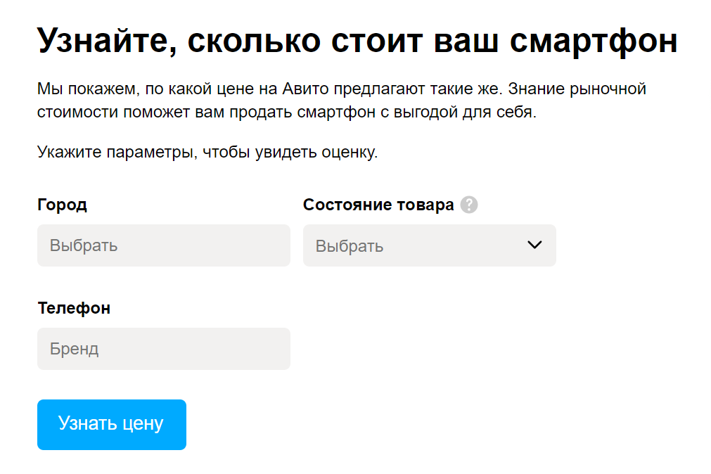 Как работает калькулятор? Чтобы определить оптимальную цену смартфона без подачи объявления, на странице калькулятора нужно ввести всего три параметра: регион, состояние товара и марку телефона. После выбора марки появится ячейка для выбора модели, а также некоторых характеристик в зависимости от нее (например объем встроенной памяти, цвет гаджета).