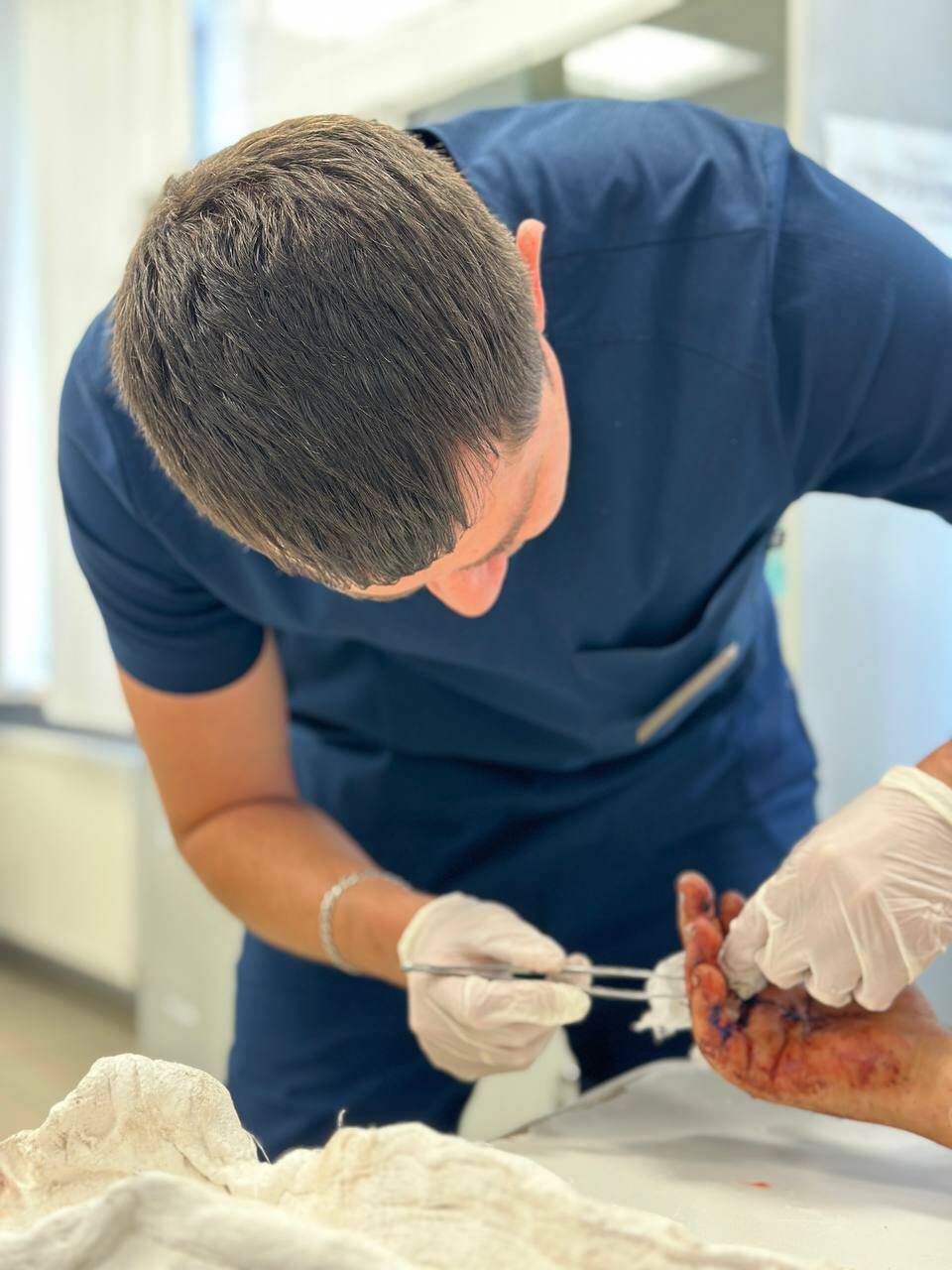 В травматологическом отделении №2 команда врачей около четырех часов проводила операцию, стабилизируя кости и восстанавливая ткани с сосудами. В настоящее время пациент находится на лечении в отделении. О возможности восстановления сухожилий можно будет говорить только через три месяца.
